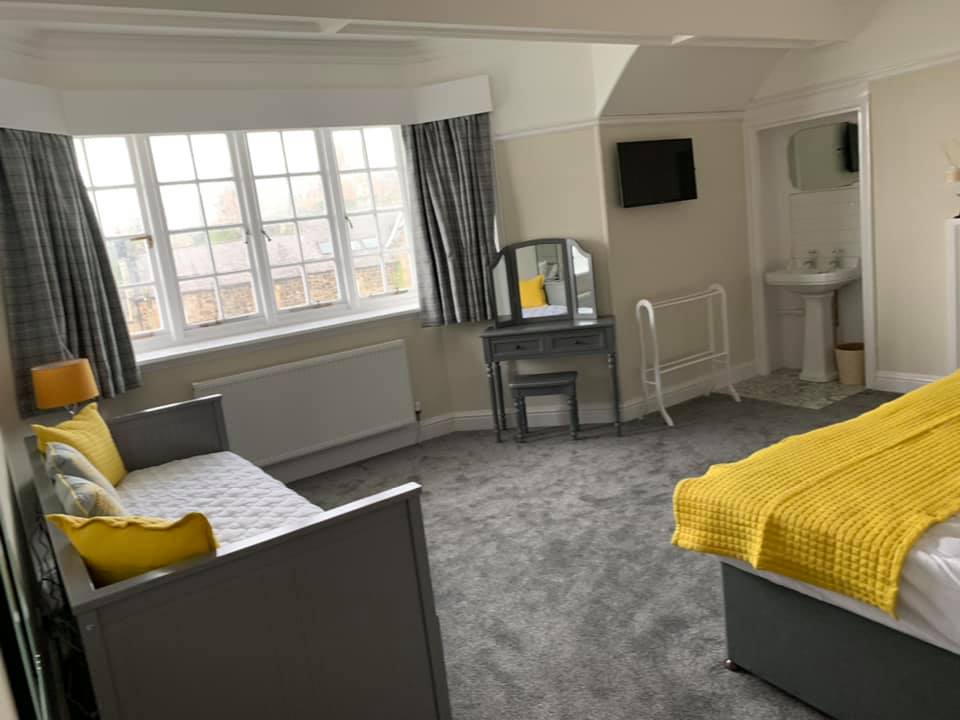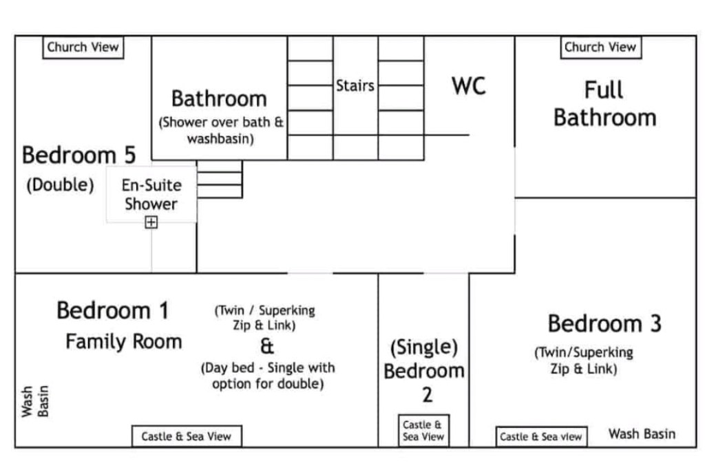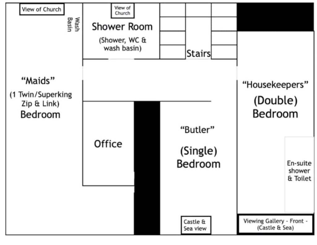 This versatile room offers multiple arrangements of beds to suit various needs of our customers. Choose from a twin or superking bed. Additionally, we can configure our day bed as a double, a single or a twin (single with pull out trundle single). This grand bedroom also offers a washbasin, feature fireplace and views of the castle and sea.
