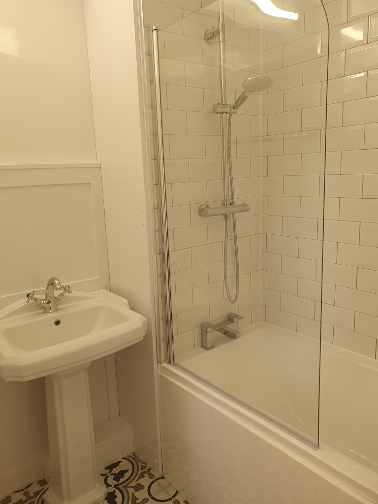 The original bathroom offers a bath, over bath shower, traditional sink and vanity unit. Please note that there are 2 steps down to access the bathroom from the first floor landing.