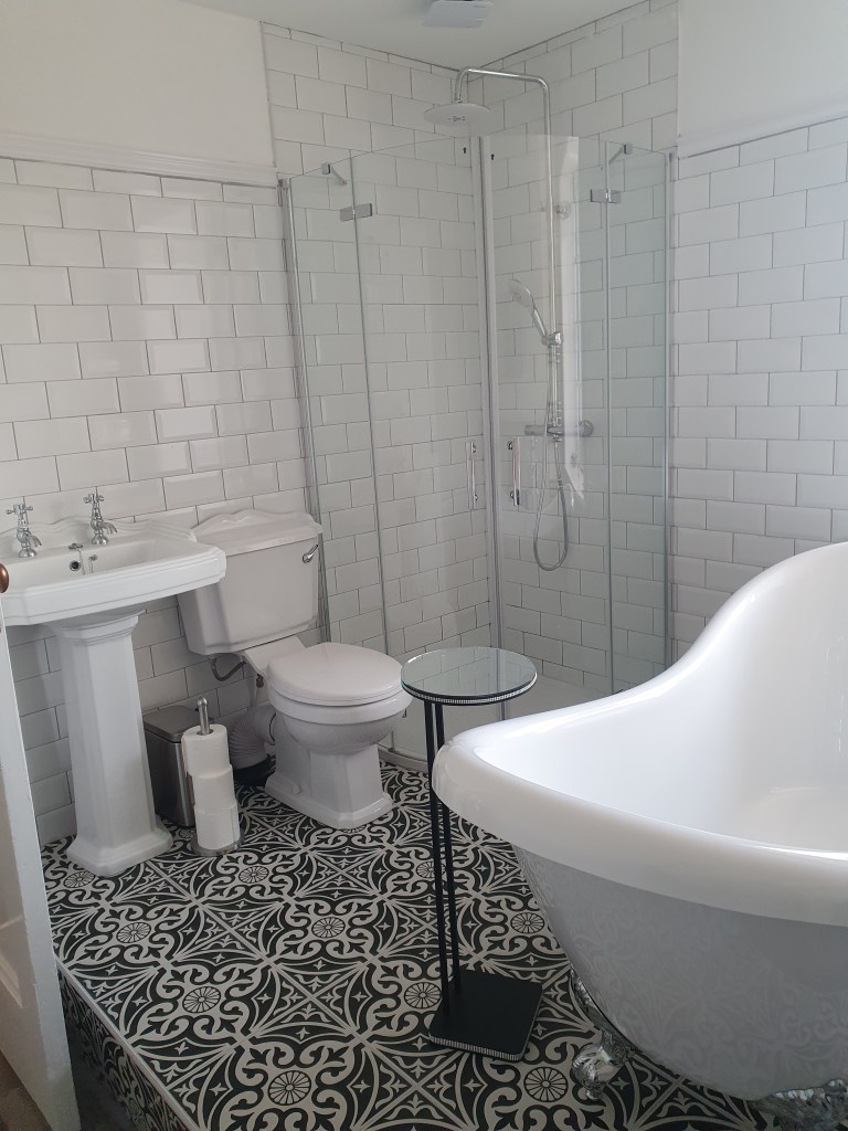 Our Bedroom 4 was too big to be a single room and too small to be a double. We didn’t have enough bathrooms….problem solved, let’s convert bedroom 4 to a luxurious Master bathroom. Enjoy the tipple of your choice whilst having a relaxing bubble bath in our standalone rolltop bath with views of the beautiful English countryside. Also offers shower, toilet and washbasin!