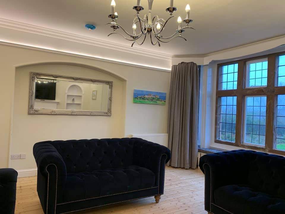 ‘Chesterfield’ style sofa seating in a horseshoe arrangement allows for easy socialising for large groups. Watch your favourite films, tv and sport on the large Smart TV, with our wood burning stove keeping you warm. Or just sit and admire the view of the castle at the window seat.
