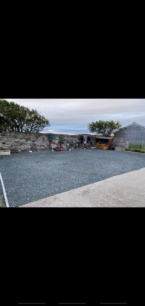 Via a private road accessible from The Wynding, you will pass through a farmer’s field and over a cattle grid to arrive at a private car park at the rear of the house. This car park is characterised by lobster pots hanging from the wall. You will be able to park 4-5 cars here.